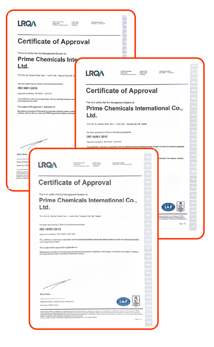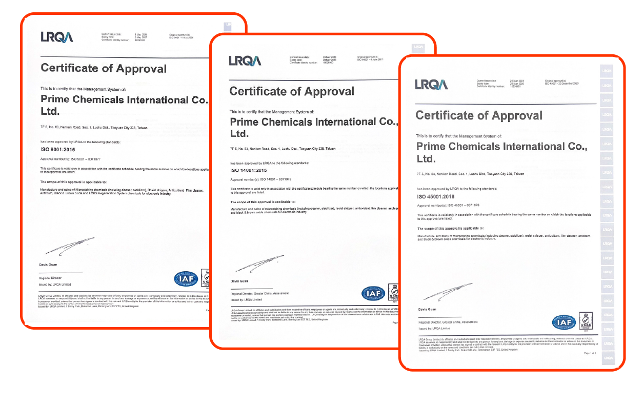 ISO 9001:2015 品質管理系統、ISO 14001:2015 環境管理系統、ISO 45001:2018 安全衛生管理系統